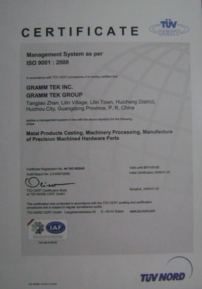ISO/TS16949認證,為更好地為車廠提供汽(qì)車配件製造服務,本公(gōng)司於2008年順利通過(guò)TUV及(jí)BSI認證TS技術規範,使得品質管製升級為技術規範來開展。